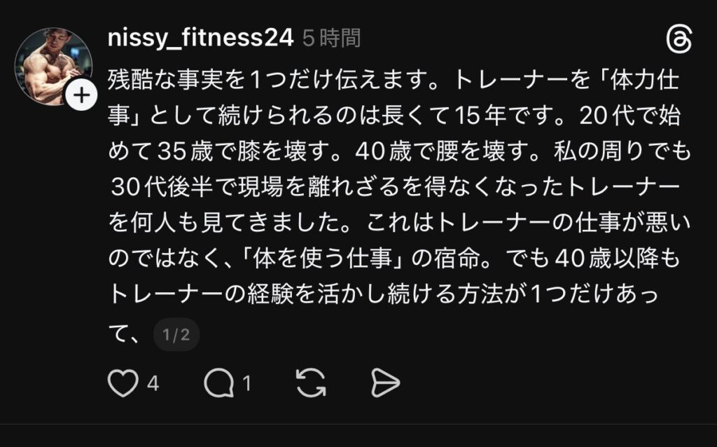 体を使う仕事。って言っているけど、体を使わないとは言わないけど、膝や腰が壊れるほどの重労働というわけでは決してありません。そもそも健康産業に従事するものとして、その健康が高々30代や40代で悲鳴をあげるってどんだけ虚弱なん?って思うんです。