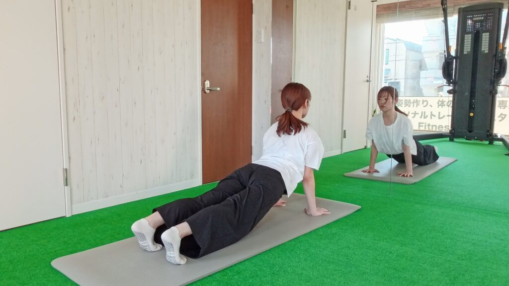 この動きの場合には背骨は屈曲から伸展へ丸めるところから反るところまで動かしています。